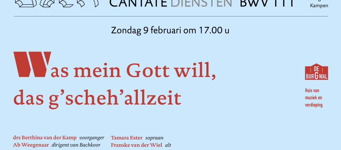 Om 17.00 uur zingt het Bachkoor en -orkest onder leiding van Ab Weegenaar de prachtige cantate: "Was mein Gott will, das g’scheh’ allzeit” BWV111 van Bach in de cantatedienst.