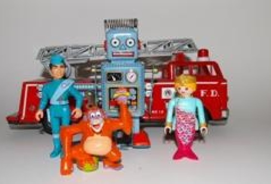 Ook verschillende cowboys, indianen, soldaten, piraten, Vikingen en boeven in actiescènes. Meccano, Fischer Technik, Action Man en Ministeck. Barbies en andere poppen in de poppenhoek. Blikken keukentjes en houten winkeltjes. Dieren op de boerderij of in de Ark van Noach. Batman, de Thunderbirds en James Bond. Een grote treinenbaan in aanbouw en ruim 2.000 speelgoed- en modelauto’s.